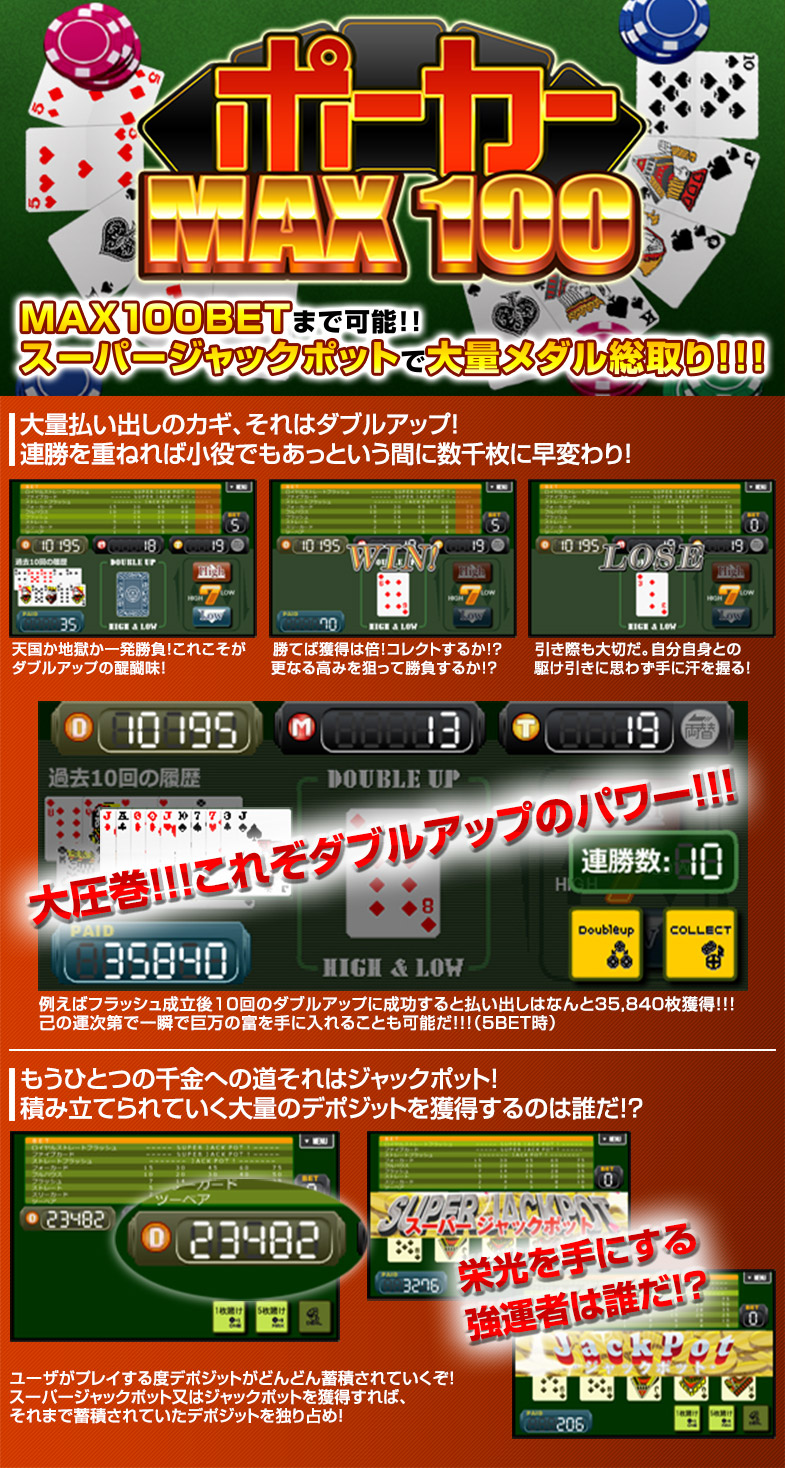 DiCE「ディーチェ」ポーカーの特殊ルールに「ジャックポット」があります。 ポイントエリアでベットされたPtの一部が供託(デポジット)されて、 チケットエリアで規定役(ロイヤルフラッシュ、ファイブカード、ストレートフラッシュ)が成立すると デポジットされたPtがメダルとして払い出されます。 「ロイヤルフラッシュ」「ファイブカード」がスーパージャックポット(SJP)でデポジットの1%×ベット枚数(最高100%)、 「ストレートフラッシュ」はノーマルジャックポット(JP)でデポジットの0.1%×ベット枚数(最高10%)が払い出されます。 現在のデポジット枚数はチケットエリアのゲーム画面左中央の「D」に表示されています。 -