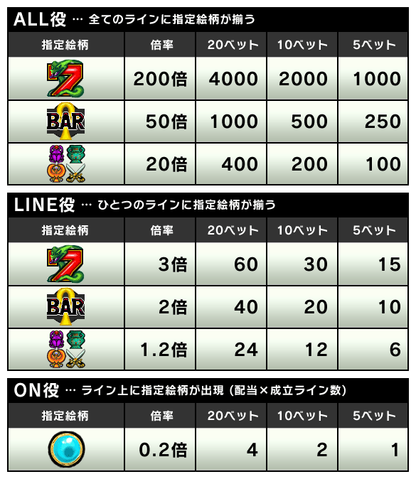 本ゲームはベット制を導入しており、「5ベット」「10ベット」「20ベット」の台をお選び頂く事が出来ます。