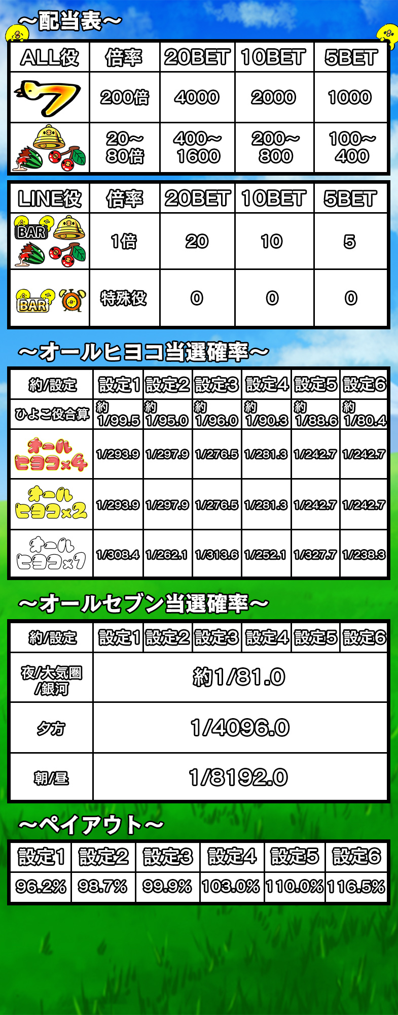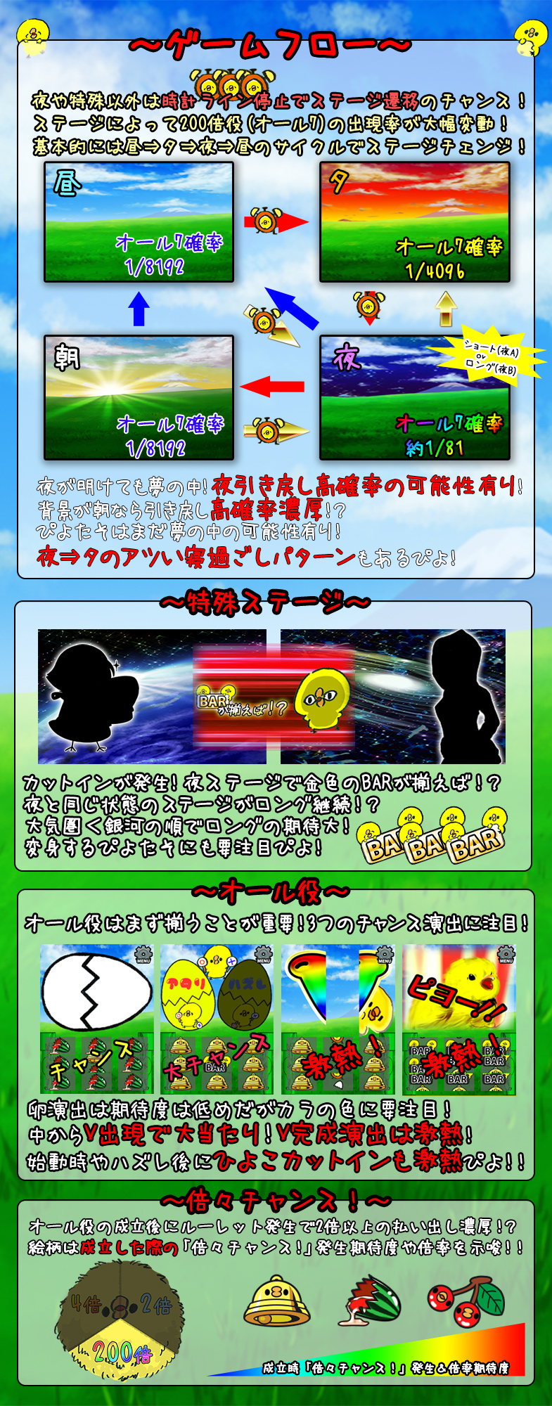 8ラインスロット「ぴよたその一日」はMAXベット専用機です(MAXベットはポイントエリアの場合5ポイントのみとなります。チケットエリアの場合は5枚/10枚/20枚の3種類の台からお選び頂けます)。