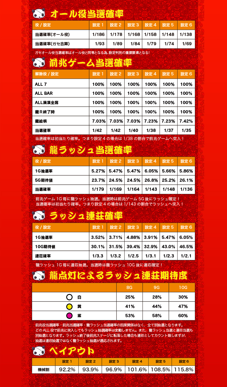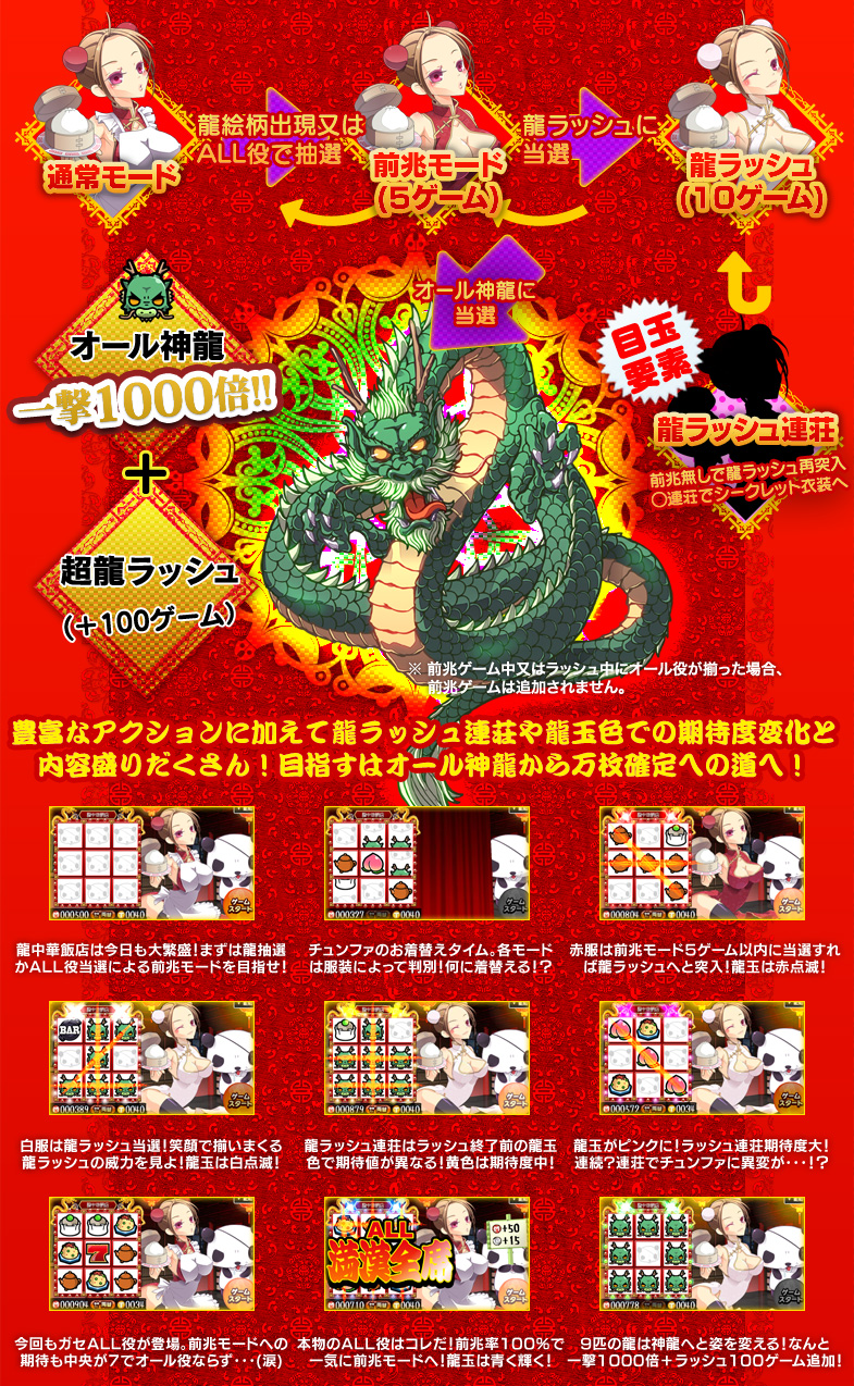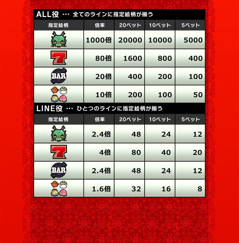 8ラインスロット「龍中華飯店」はMAXベット専用機です(MAXベットはポイントエリアの場合5ポイントのみとなります。チケットエリアの場合は5枚/10枚/20枚の3種類の台からお選び頂けます)。