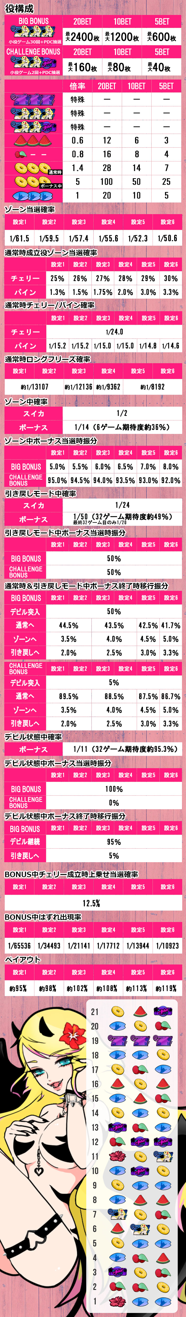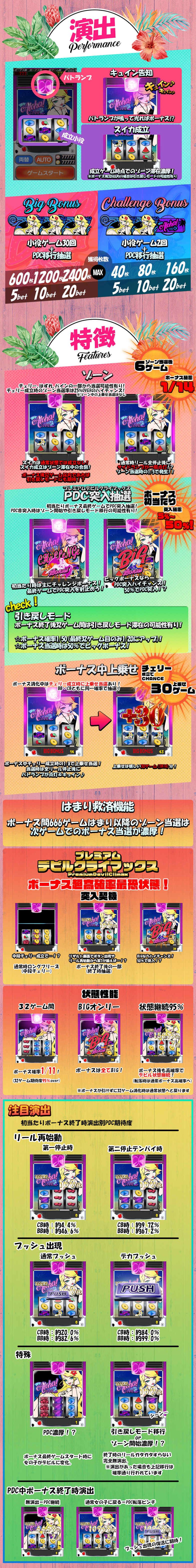 DiCE「ディーチェ」の8ラインスロットは、コンピューターと対戦する1人用ゲームです。 8ラインスロット「遊々アロハ!DEVILver」では1回のゲームで5Ptまたは5枚/10枚/20枚のスロットメダルをベットすることができ、対応するラインに各絵柄が揃うと払出しを受けることが出来ます。 複数の有効ラインに絵柄が揃った場合は成立数分が加算されます。 -